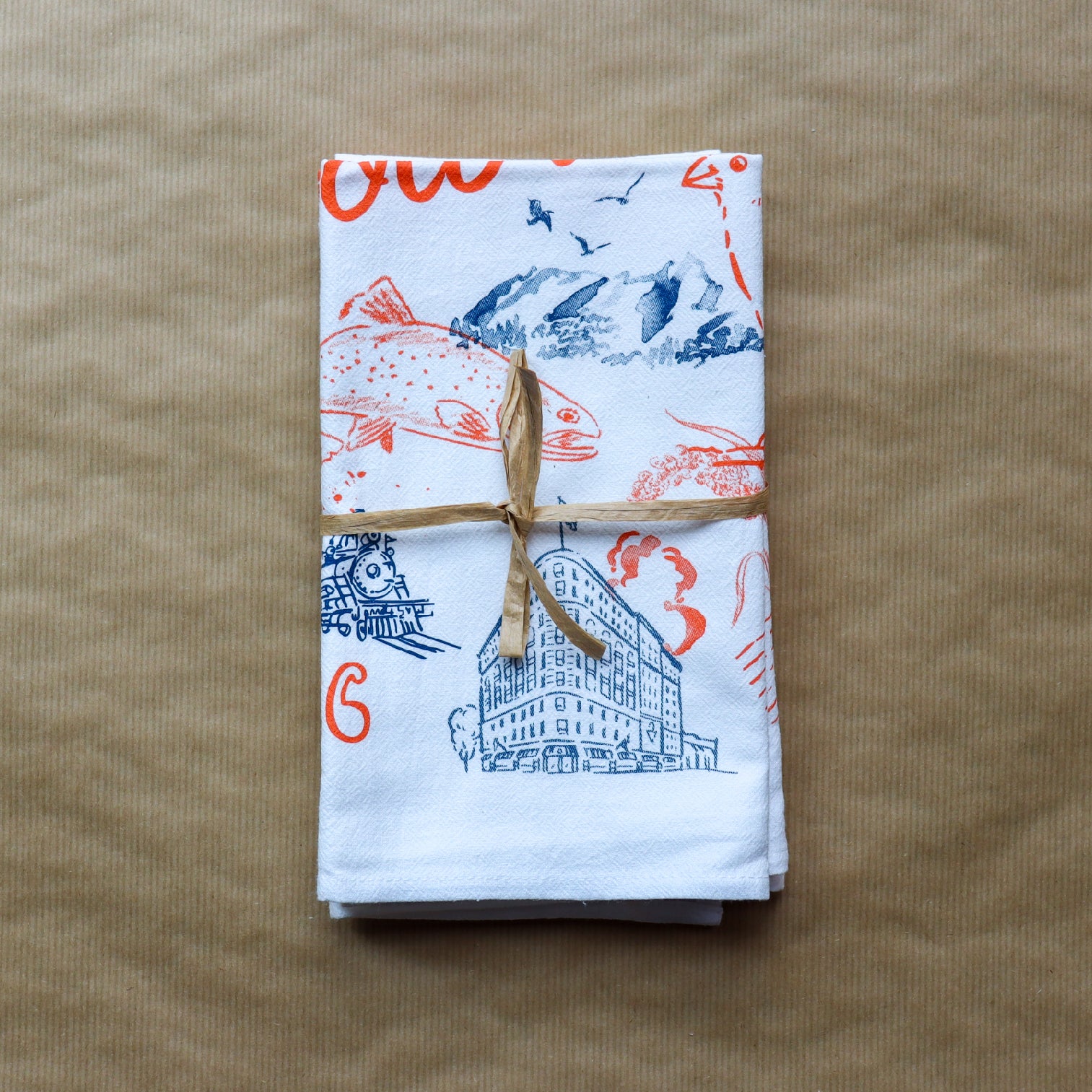 THREE High-quality 100% cotton 17” x 38” flour sack towel with 2-color print. Folded and wrapped with a raffia tie.